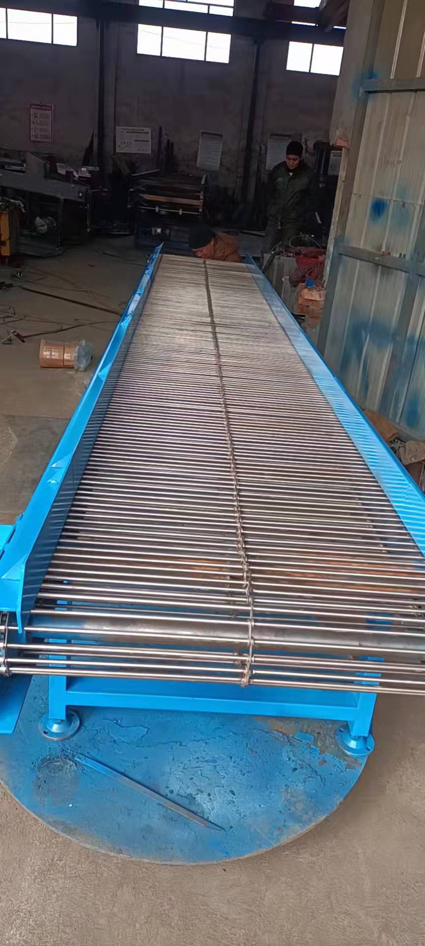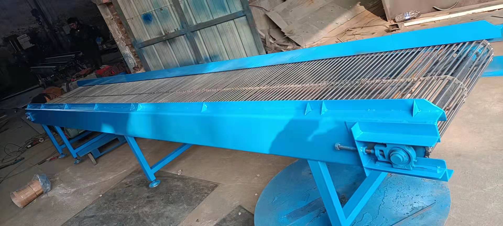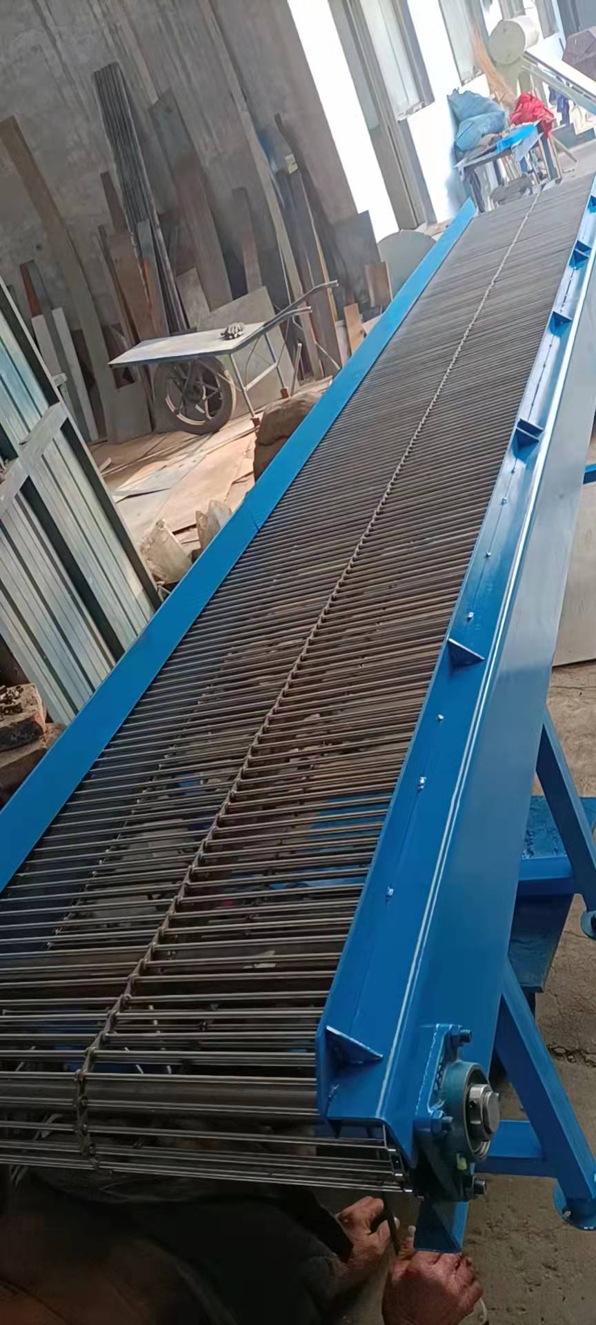 給淄博 山東超越輕工制品有限公司定做的玻璃瓶降溫傳送帶輸送機完工今天發貨 鏈桿片輸送機 長度5米 有效寬度720毫米 高度800毫米 從地面到鏈桿輸送帶上平面是800毫米 可調節的高度再700-800毫米之間 實際調節距離100毫米 節距25.4毫米 支軸直徑8毫米 在輸送帶中間加一趟鏈條片