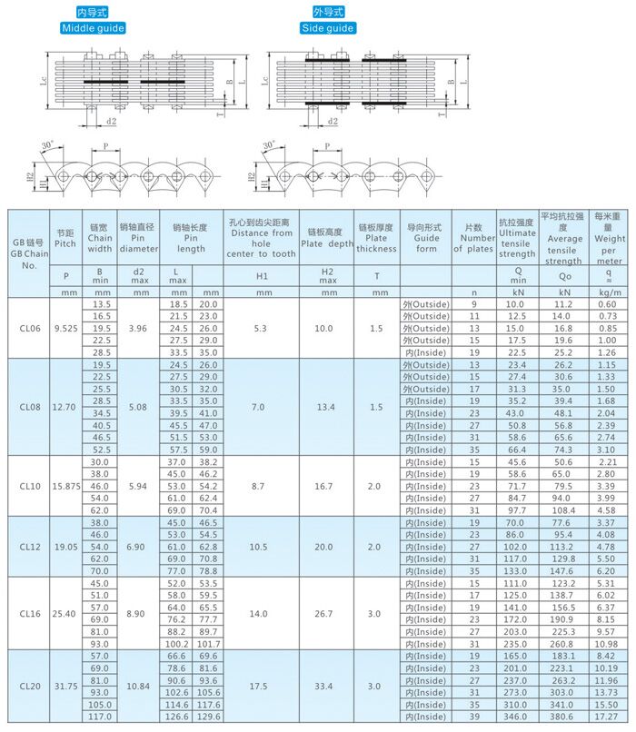 齒形鏈條的種類(lèi):CL06,CL08,CL10,CL12,CL16,CL20。