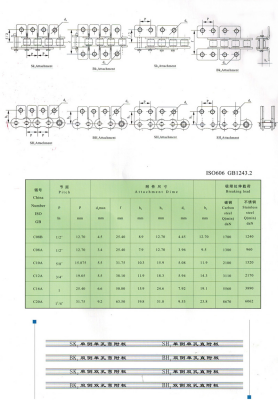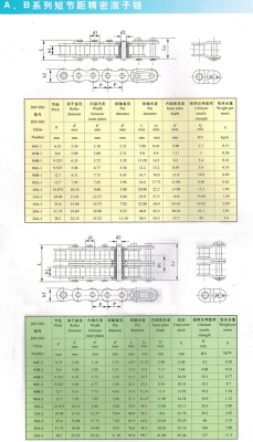 (2)現在靜音無聲齒形鏈條應用越來越廣泛,高速無聲靜音低噪音鏈條齒輪應用越來越普遍,有的人把原來的同步帶都換成這種無聲齒形鏈條,有的人使用滾子鏈條噪音太大,也在改成無聲齒形鏈條齒輪。有的高精密要求傳送傳遞精度高的輸送線也在采用無聲齒形鏈條齒輪,好多鍛造行業快速的傳送鍛造件也在采用無聲齒形鏈條,在輸送線上有好多需要平穩輸送的也在采用無聲齒形鏈條作為輸送帶來輸送物件。目前齒形鏈條有一秒16米到30米,無聲齒形鏈條有單軸的,有雙軸的,節距有9.525毫米的型號CL06 SC3,12.7毫米的CL08 SC4 C4,15.875毫米的無聲齒形鏈條CL10,SC5 ,19.05毫米的CL12 SC6 ,25.4毫米的CL16,SC6;31.75毫米齒形鏈條CL20 SC10 ,無聲齒形鏈條38.1毫米CL24 .