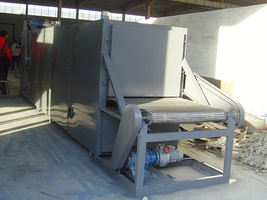 物料由加料器(或手工操作)均勻地鋪在網(wǎng)帶上,網(wǎng)帶一般采用12~16目的不銹鋼絲網(wǎng)(也可根據(jù)物料不同選擇不同的網(wǎng)帶、鋼帶),由轉(zhuǎn)動(dòng)裝置拖動(dòng)在干燥機(jī)內(nèi)移動(dòng)。干燥機(jī)由若干單元組成,每一單元熱風(fēng)可獨(dú)立循環(huán),部分尾氣由專門的排濕風(fēng)機(jī)排出,廢氣排出量由調(diào)節(jié)閥控制。熱氣由下向上穿過鋪滿物料的網(wǎng)帶,完成熱量與質(zhì)量的傳遞,帶走物料水分,從而實(shí)現(xiàn)干燥過程。網(wǎng)帶允許的速度可根據(jù)物料水份及溫度要求調(diào)節(jié),單元數(shù)量也可根據(jù)需要選取。
