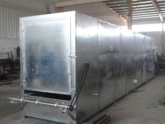 物料由加料器(或手工操作)均勻地鋪在網帶上,網帶一般采用12~16目的不銹鋼絲網(也可根據物料不同選擇不同的網帶、鋼帶),由轉動裝置拖動在干燥機內移動。干燥機由若干單元組成,每一單元熱風可獨立循環,部分尾氣由專門的排濕風機排出,廢氣排出量由調節閥控制。熱氣由下向上穿過鋪滿物料的網帶,完成熱量與質量的傳遞,帶走物料水分,從而實現干燥過程。網帶允許的速度可根據物料水份及溫度要求調節,單元數量也可根據需要選取。