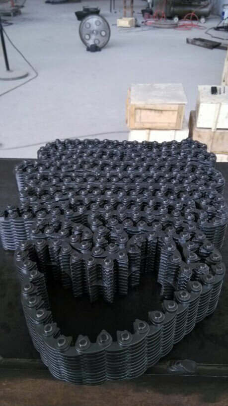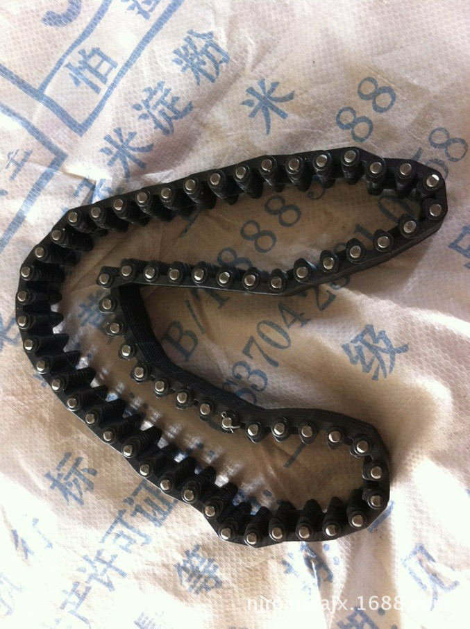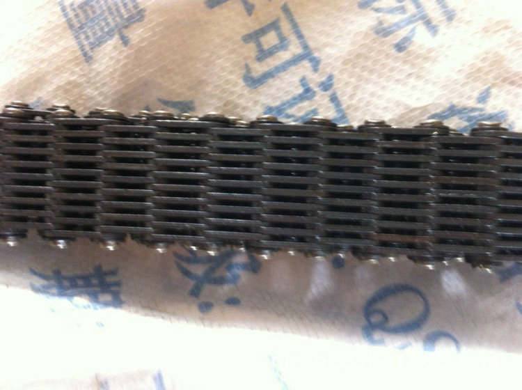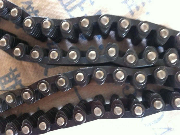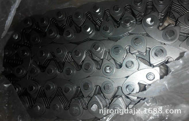 齒形鏈條簡介:也叫無聲鏈,傳動鏈條,齒型鏈條,英文Silent chain,屬于傳動鏈條的一種形式。我國的國家標準:GB/TB10855-2003《齒形鏈和鏈輪》。齒形鏈是由一系列的齒鏈板和導板交替裝配且銷軸或組合的鉸接原件連接而成。根據導向形式可分為:外導齒形鏈,內導齒形鏈或雙內導齒形鏈。