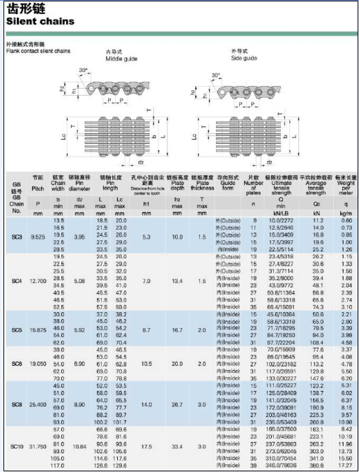 CL08-CL20齒形鏈條,sc3-sc10無聲鏈條:無聲鏈條,一種傳動鏈條。齒形鏈條是一種無音鏈條,傳動精度高,齒形鏈條無噪音,齒形鏈條傳動速度高,齒形鏈條節距從9.525毫米到31.75毫米,齒形鏈條腰部弧形,跟直行的SC4齒形鏈條不一樣。