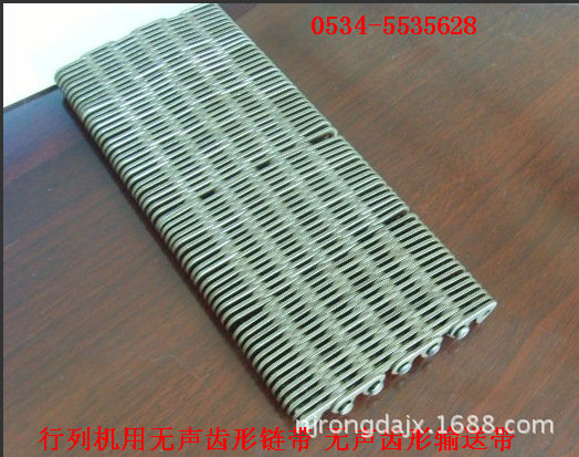 無聲齒形鏈帶:一種輸送帶,是玻璃廠或者陶瓷制品廠用來輸送玻璃制品器皿,玻璃容器或者陶瓷廠用來輸送陶瓷瓶罐,陶瓷制品的輸送帶。利用無聲鏈輪帶動,具有無噪音,耐磨,抗拉伸,輸送面平穩,耐高溫。