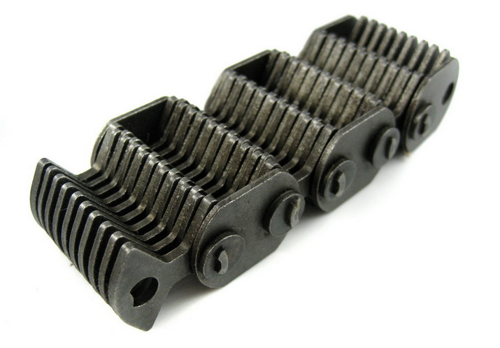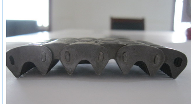 這種鏈條總計一節41片,外導向的,兩側各一片導向片,中間是帶尖的齒形鏈片,哈瓦鏈條傳動速度最快,精度最高,噪音最低,成為無聲鏈條,是目前國際上最精密的一種傳動鏈條。