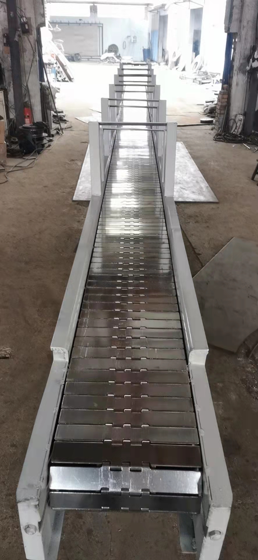 鍛造件輸送帶,鍛造件傳送帶的材質:鏈板是不銹鋼的,厚度3毫米。