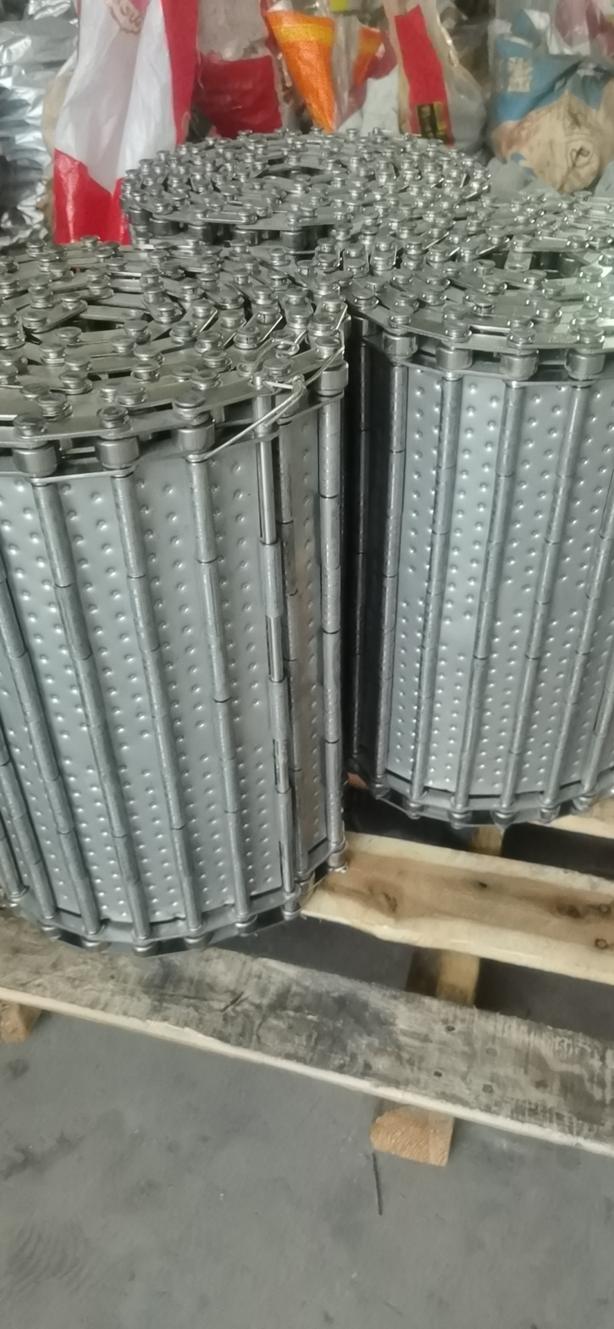 給客戶定做的輸送帶, 有效寬度800毫米 板厚1.0毫米 鏈條50.8毫米 支軸8毫米 橫擋板側擋板有效高度60毫米 橫擋板間距100毫米 。
