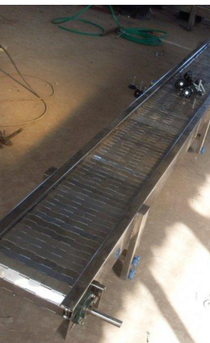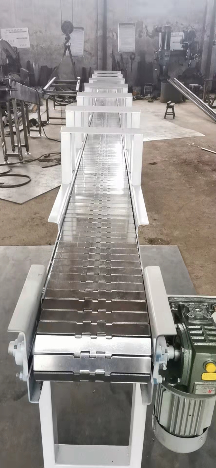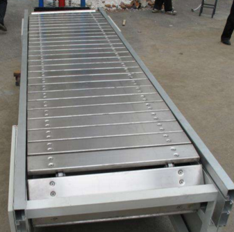 鏈板輸送機:又叫鏈板傳送機,鏈板線,鏈板傳送帶。是一種利用循環往復的鏈條作為牽引動力,以金屬板作為輸送承載體的一種輸送機械設備。國內市場上有兩種鏈板輸送機,一種是用鏈條,支軸和金屬板組成的輸送鏈板做成的輸送機;一種是用帶彎板的鏈條和金屬板組成的金屬板輸送帶做成的鏈板輸送機,另一種是平頂鏈鏈板輸送機。