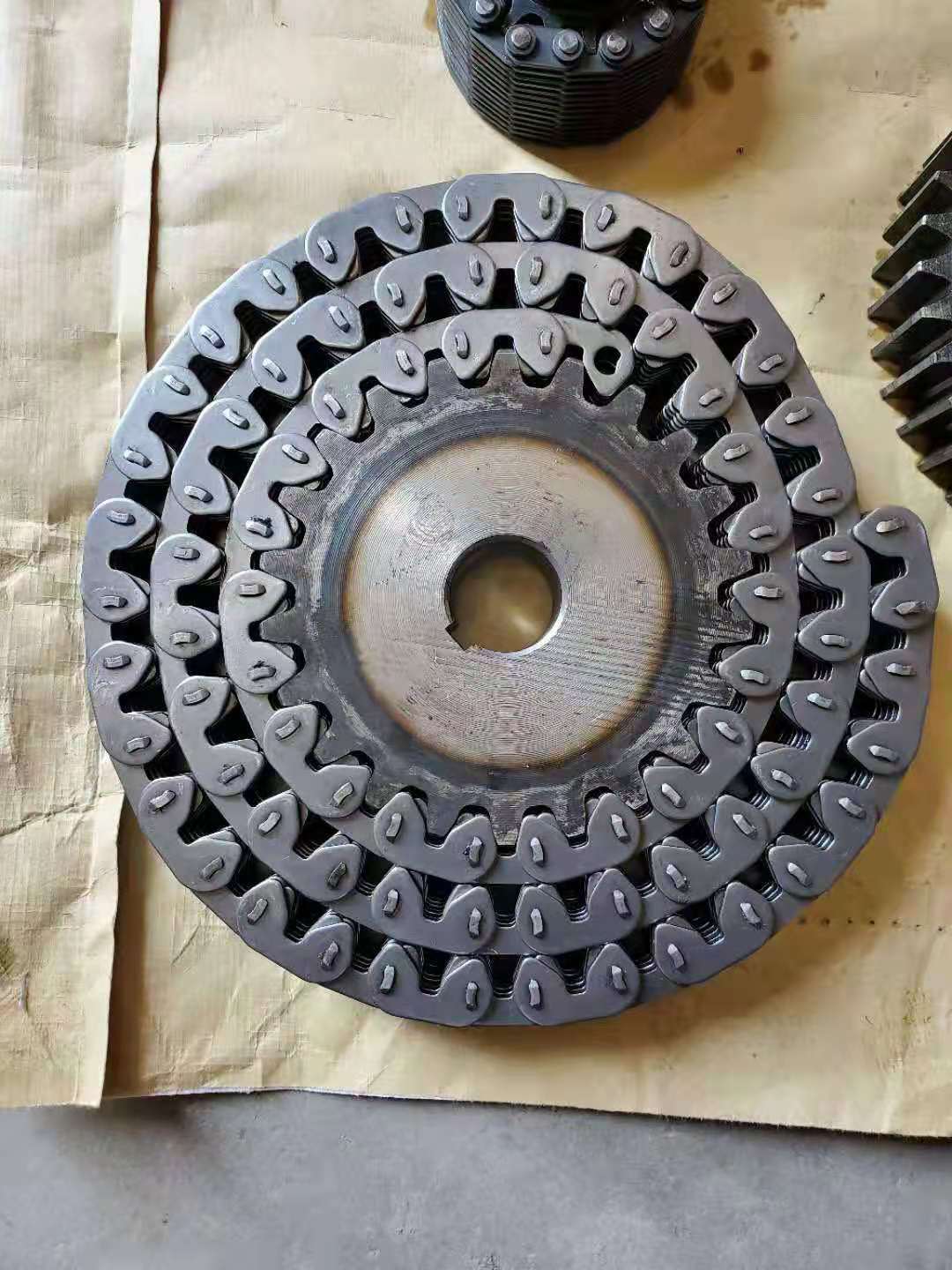 無聲鏈 齒形鏈輪 無聲鏈:也叫齒形鏈條,采用無聲齒形鏈輪帶動運轉傳動。寧津縣榮達機械制造有限責任公司定做各種無聲齒形鏈條,無聲齒形鏈輪。我們根據客戶自己的情況,客戶選型成功,我們根據客戶的數據非標定做各種齒形鏈條和無聲齒形鏈輪。齒形鏈條節距4.7625,6.35 9.525 12.7 15.875 19.05 25.4 31.75 38.1毫米的鏈條都能做,無聲齒形鏈輪根據客戶的齒數和外徑,內孔,鍵槽定做。無聲齒形鏈條的獨特優點:高速,無噪音,高承載傳動能力,轉矩大等等優點,逐漸取代精密滾子鏈條和同步帶。
