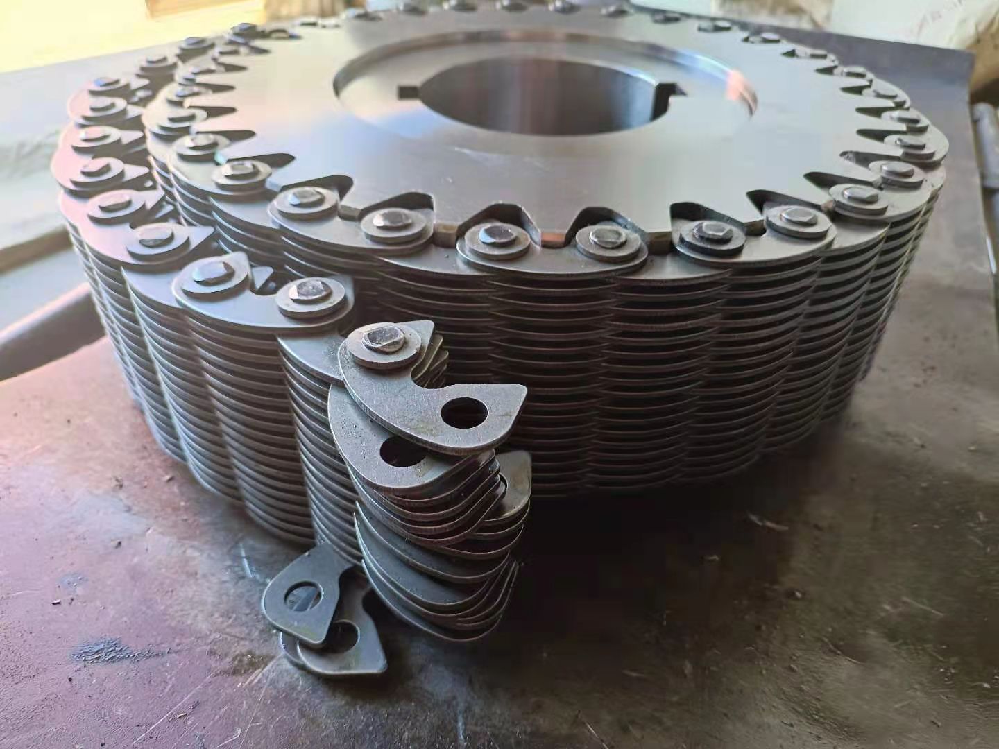 無聲鏈 齒形鏈輪  無聲鏈:也叫齒形鏈條,采用無聲齒形鏈輪帶動運轉傳動。寧津縣榮達機械制造有限責任公司定做各種無聲齒形鏈條,無聲齒形鏈輪。我們根據客戶自己的情況,客戶選型成功,我們根據客戶的數據非標定做各種齒形鏈條和無聲齒形鏈輪。齒形鏈條節距4.7625,6.35  9.525  12.7  15.875  19.05  25.4  31.75  38.1毫米的鏈條都能做,無聲齒形鏈輪根據客戶的齒數和外徑,內孔,鍵槽定做。無聲齒形鏈條的獨特優點:高速,無噪音,高承載傳動能力,轉矩大等等優點,逐漸取代精密滾子鏈條和同步帶。