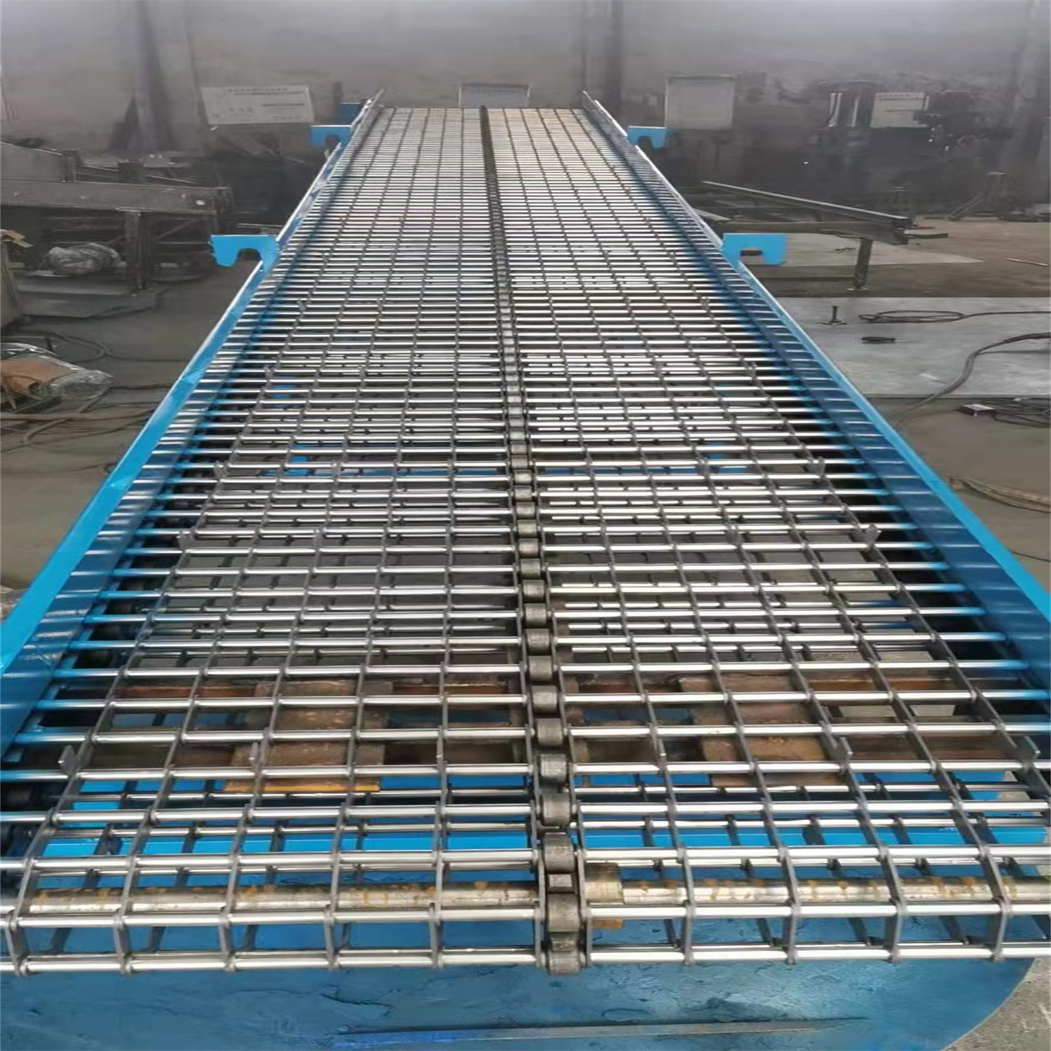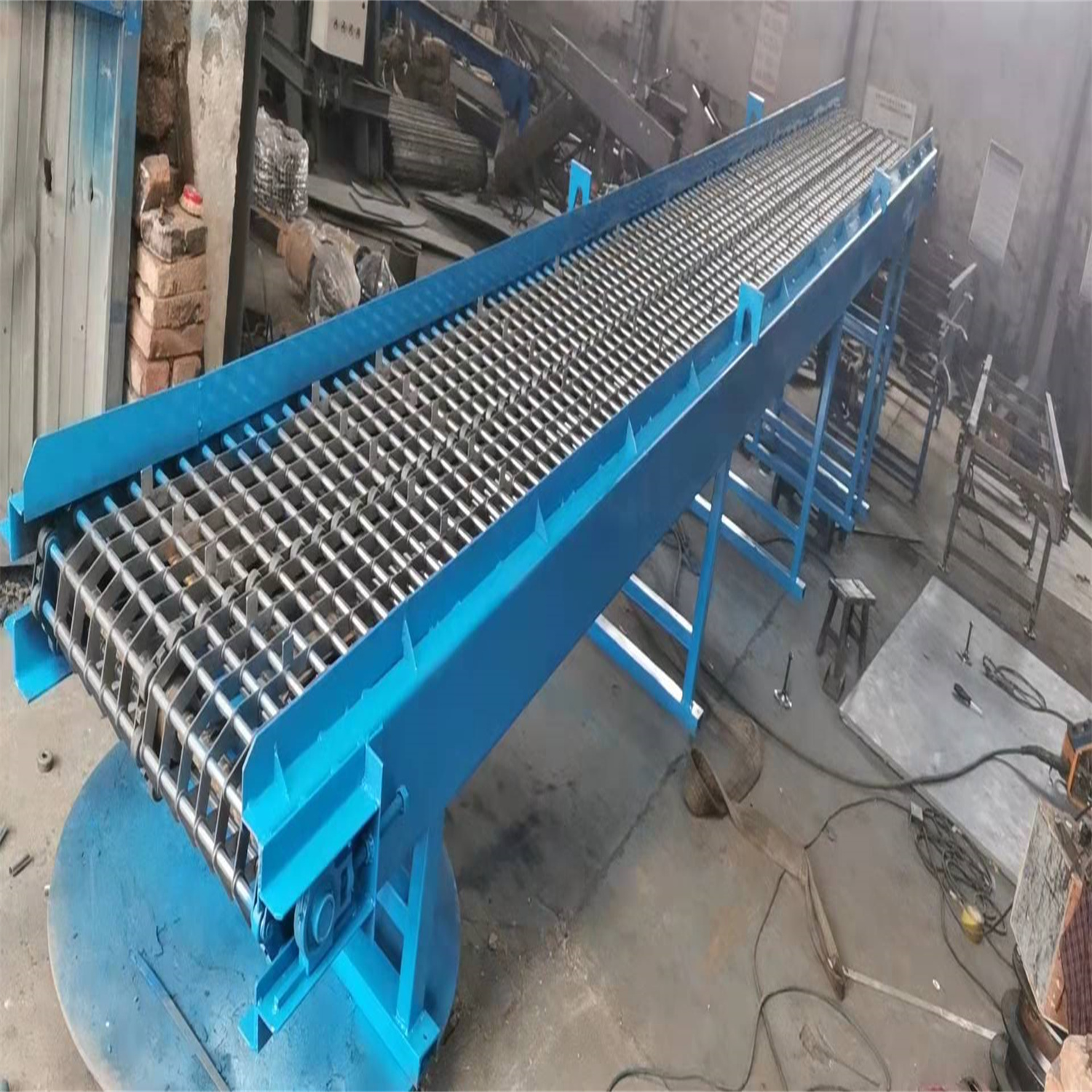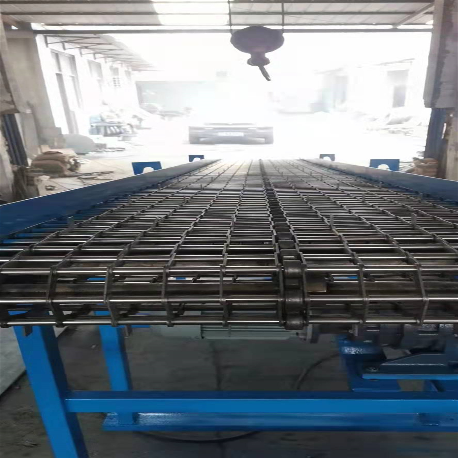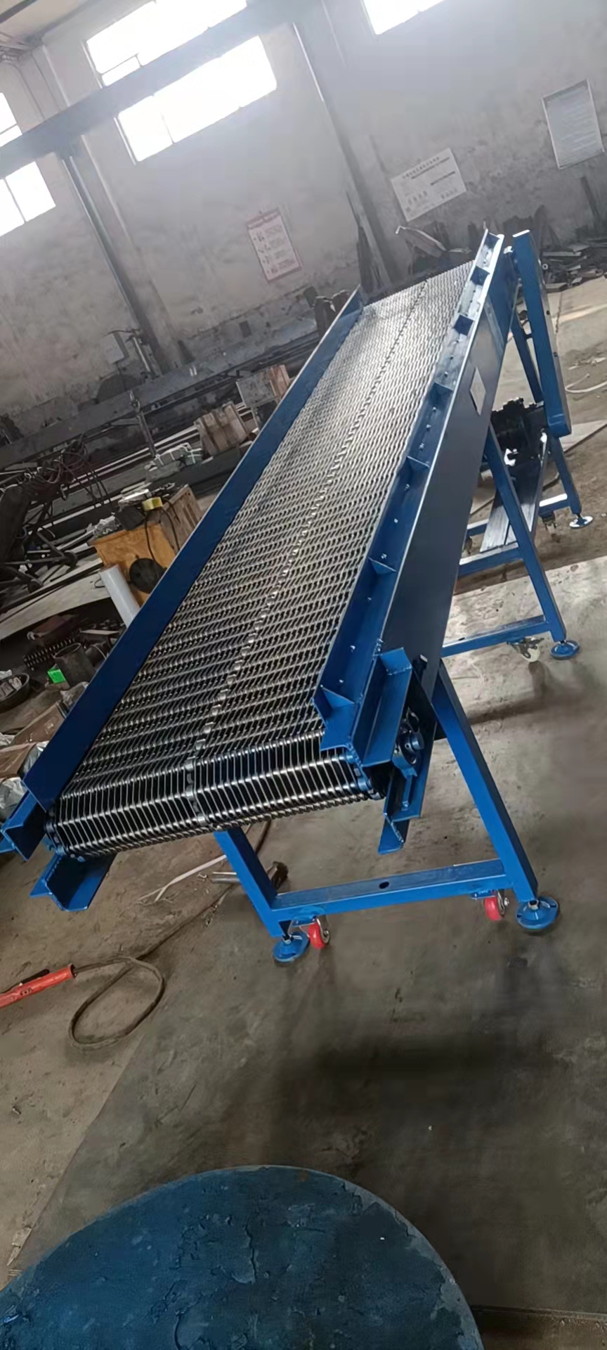 給成都欣欣高強度緊固件有限公司做的鏈條片傳送帶輸送機完工 長度3.5米 有效凈寬度600毫米 一個件從機頭到機尾20分鐘 相當于0.6米每分鐘的運行速度 不要風機 高度從780毫米 往上可調300毫米 速度可調 帶變頻器 采用鏈條片輸送帶 節距50.8毫米 支軸12毫米 帶三排鏈條 1.5千瓦 雙極減速機 完工