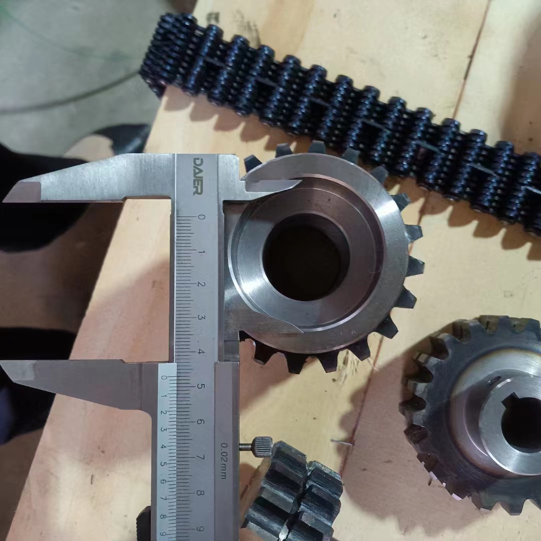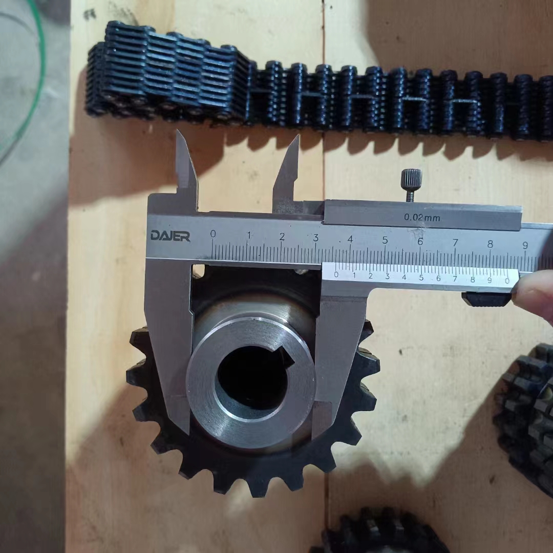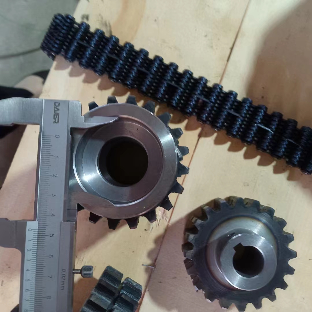 無聲鏈 齒形鏈輪 無聲鏈:也叫齒形鏈條,采用無聲齒形鏈輪帶動運轉傳動。寧津縣榮達機械制造有限責任公司定做各種無聲齒形鏈條,無聲齒形鏈輪。我們根據客戶自己的情況,客戶選型成功,我們根據客戶的數據非標定做各種齒形鏈條和無聲齒形鏈輪。齒形鏈條節距4.7625,6.35 9.525 12.7 15.875 19.05 25.4 31.75 38.1毫米的鏈條都能做,無聲齒形鏈輪根據客戶的齒數和外徑,內孔,鍵槽定做。無聲齒形鏈條的獨特優點:高速,無噪音,高承載傳動能力,轉矩大等等優點,逐漸取代精密滾子鏈條和同步帶。