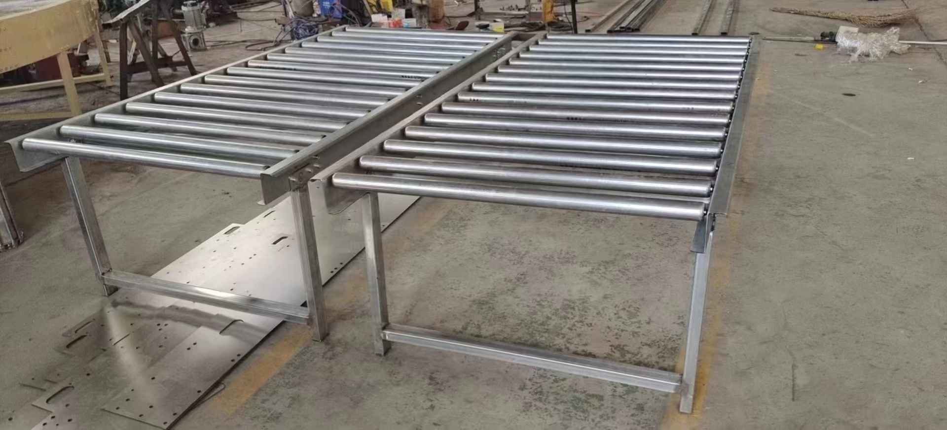 輥道的曲線段采用圓錐形輥子或雙排圓柱形輥子,可使物品轉彎。短輥道可以縮短輥子的間距,自重較輕。輥道一般稍下傾,當物品較重、線路較長時,為了推動物品時省力,斜度可取1~1.5%。如要使物品自滑,斜度可增大到2~3%。影響自滑斜度大小的因素很多,大多用實驗確定合適的角度。當線路長度小于10米、物品輕于 200千克時,可以布置成水平線路。自滑式輥道不易控制物品下滑速度,所以長度一般不大。輥道的寬度比物品寬度大100~150毫米。曲線段最小曲率半徑為輥道寬度的3~4倍。輥子間距為輸送物品長度的1/3~1/4,當物品輸送的平穩性要求較高時。間距可取輸送物品長度的1/4~1/5。輥子直徑按載荷大小決定。