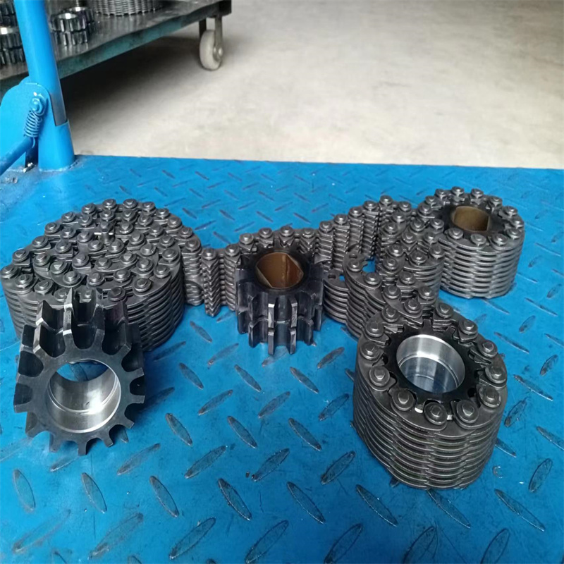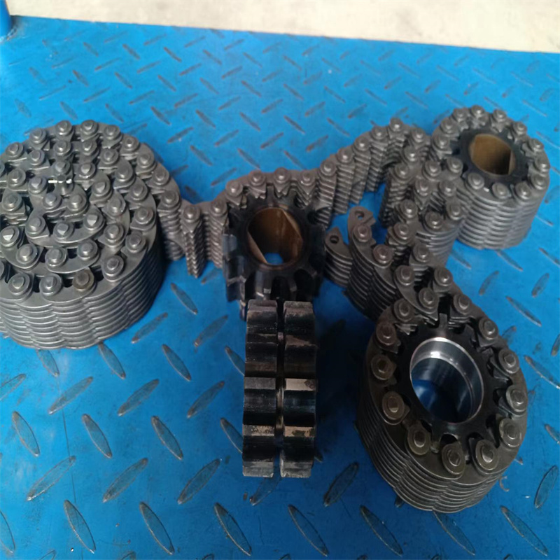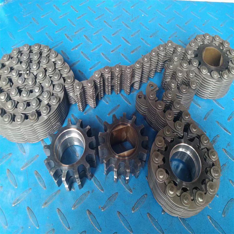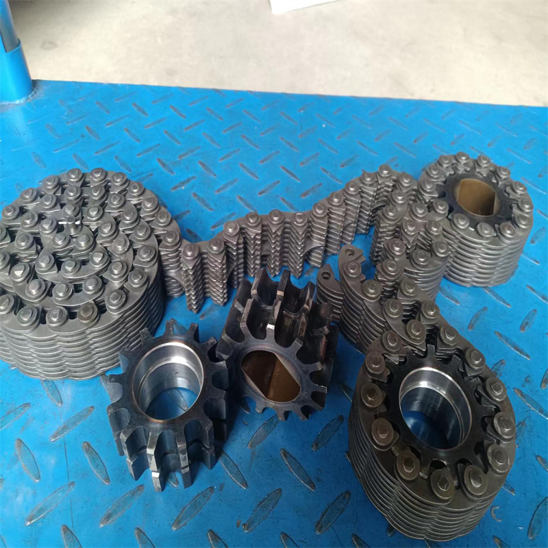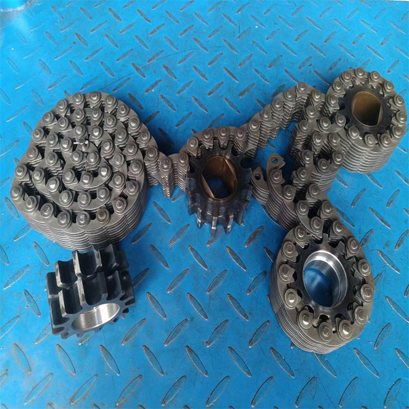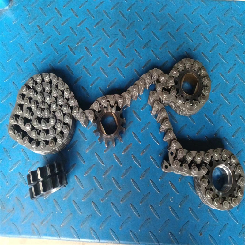 無聲鏈 齒形鏈輪 無聲鏈:也叫齒形鏈條,采用無聲齒形鏈輪帶動運轉傳動。寧津縣榮發齒輪廠定做各種無聲齒形鏈條,無聲齒形鏈輪。我們根據客戶自己的情況,客戶選型成功,我們根據客戶的數據非標定做各種齒形鏈條和無聲齒形鏈輪。齒形鏈條節距4.7625,6.35 9.525 12.7 15.875 19.05 25.4 31.75 38.1毫米的鏈條都能做,無聲齒形鏈輪根據客戶的齒數和外徑,內孔,鍵槽定做。無聲齒形鏈條的獨特優點:高速,無噪音,高承載傳動能力,轉矩大等等優點,逐漸取代精密滾子鏈條和同步帶。