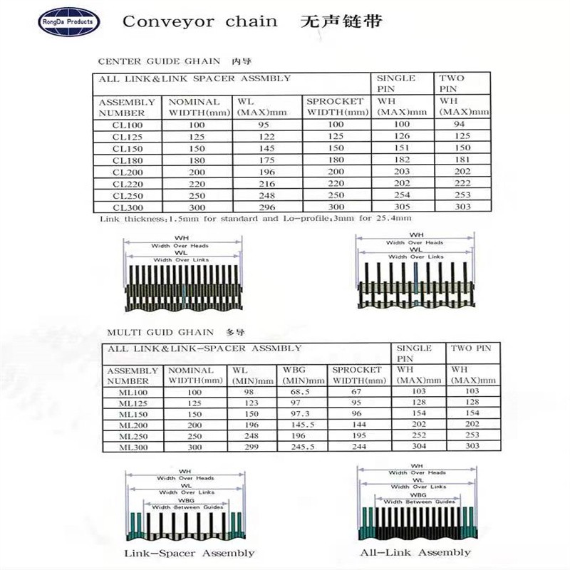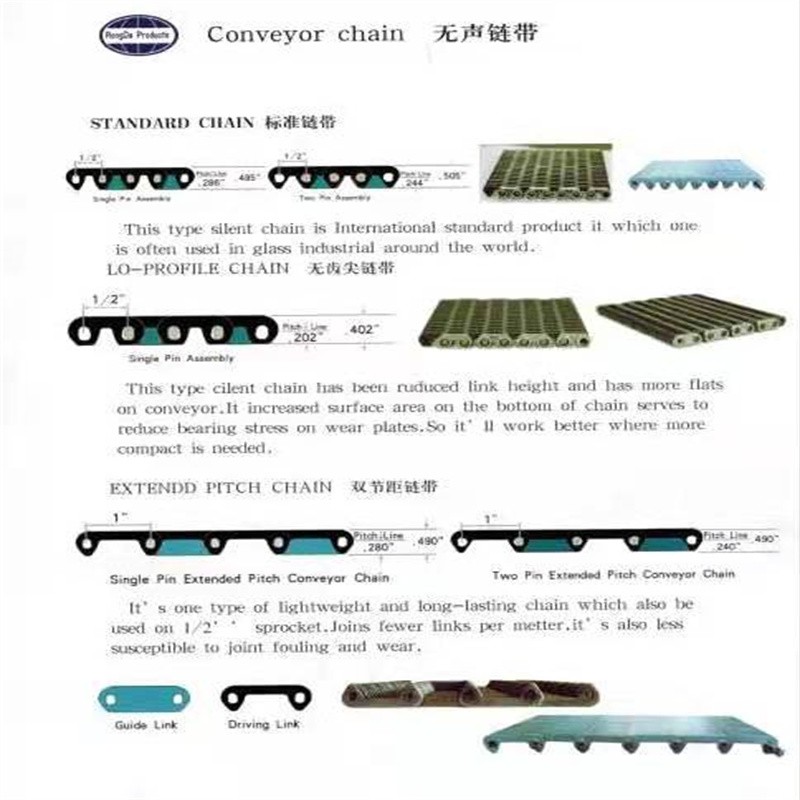 1.無聲齒形鏈帶:一種金屬輸送帶,采用鏈條片和銷軸于墊圈做成的輸送用傳送帶,外形寬度非標(biāo)定做也有好多規(guī)格的現(xiàn)貨,鏈帶是用在玻璃廠輸送玻璃瓶罐器皿日用玻璃器皿的,也有的時候用在其他的輸送機(jī)械上,用來輸送其他產(chǎn)品,無聲齒形鏈帶的優(yōu)點(diǎn)就是平整,輸送面平穩(wěn),輸送高腳杯,不會倒瓶,無聲齒形鏈帶用來輸送高溫玻璃制品,用于玻璃機(jī)械行列式制瓶機(jī)上,橫向輸瓶機(jī),我們現(xiàn)在還研發(fā)了轉(zhuǎn)彎的拐彎的無聲齒形鏈帶,用于縱向拐彎橫向結(jié)合的輸送機(jī)上。無聲齒形鏈帶材質(zhì)有碳鋼的 錳鋼的 合金鋼的 ,節(jié)距有12.7毫米 25.4毫米 單軸的和雙軸的,無齒形鏈帶從外形看有內(nèi)導(dǎo)向和外導(dǎo)向,無聲齒形鏈帶有帶保護(hù)帽的和不帶保護(hù)帽的,無聲齒形鏈帶有帶尖的和不帶尖的。寬度125毫米 150毫米 200毫米 300毫米 常年有現(xiàn)貨 當(dāng)天下單當(dāng)天發(fā)貨 配套的無聲齒形鏈輪有現(xiàn)貨 英文名稱Silent tooth chain ,顏色有發(fā)黑的有本色的。常規(guī)的是5米一件 五米一木箱 ,用于輸送機(jī)上一般是每分鐘15米左右
